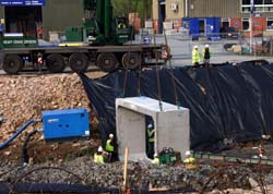 A38 Dobwalls Bypass - March 2007 - Diverting the East Looe RiverThe East Looe River flows in the valley at Moorswater. Here a new culvert is being constructed so the dual carriageway can be built over the river. The river has been temporary diverted whilst pre formed rectangular structures are lowered into place and sealed.