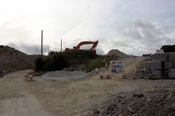 A38 Dobwalls Bypass - August 2007 - Looe MillsWhilst the line of the Moorswater distributor road was being excavated, the bungalow at Looe Mills was being used by the site workmen. Now the excavations are nearly complete, the bungalow is in the way. So first the roof tiles are removed. And in the old cafe car park a retaining wall is being built. later in August, returning to work one Friday lunchtime I saw the walls being knocked down and guess what - I did not have my camera on me! By the time I returned in the evening the bungalow had been demolished. The retaining wall in the cafe car park takes shape. All that is left is rubble . This is from the old cafe car park looking west. Accross the road, preformed concrete block stand in a strange alignment. |