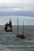 16th June 2007- Looe Lugger regatta - amOrganised by the Cornish Lugger Association, this biennial celebration of surviving sailing luggers meets in Looe, Cornwall.2007 is the eleventh regatta, and our local luggers are joined by luggers from further afield including Brittany, France. Just after 9am the luggers start to leave the harbourside at Looe, and make their way down river. My vantage point today is on the Banjo Pier East Looe. With an on shore wind and no engine, then the only way is to row. At the river mouth we go side on! And safely out into the bay There are several classes, Class A for luggers over 30-ft and Class B for the smaller inshore open boats. They move towards the starting line for the mornings race. The sails of a lugger are distinctive with the different coloured topsail tags. |