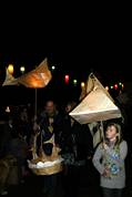 23rd December 2007 - Tom Bawcock's Eve at MouseholeLegend tells of a lengthy storm when the villagers of Mousehole could not get out of the harbour to fish. Close to starvation one of the fishermen, Tom Bawcock, went out to sea during a lull in the storm.Braving the storm, he caught 7 types of fish and bought them back into the village. This is now celebrated each year with a lantern parade through the village and the baking of Starry Gazey pie. A piper and drummer leads the procession through the narrow streets. Tradition has that Tom Bawcock's catch of Pilchards was baken in a pie known as Starry Gazey pie. Where the heads of the Pilchards stick out from the crust. Starry Gazey pie is cooked at the Ship Inn and at midnight it is eaten by the locals. Look below and you can see a lantern in the shape of the pie. Tom Bawcock's story is told in the children's story Mousehole Cat by Antonia Barber. The procession ends up on the beach. A male voice choir sings carols and some of the lanterns are floated on the water. Here is a close up of the Starry Gazey pie. |