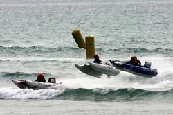 Zapcats are inflatable cataramans with a tunnel hull design. With a crew of two, they are fitted with a fifty horse power tiller steered engine and only weigh 48 kg. The racers need nerves of steel as they face walls of water. From the SW cliff path I watched the final two heats of the day. At the start of each heat the Zapcats head straight into the breaking surf. At the start of each heat the Zapcats head straight into the breaking surf. They then go parallel to the shore before turning into shore and round the next bouy to skim the shoreline. Today, each heat is five laps of the course. The final heat of the day. And the winner pasases the chequered flag. For more on Zapcat racing check out the official site. Click here for more on Watergate bay and the Extreme Academy. |