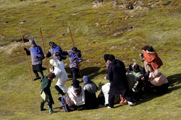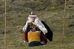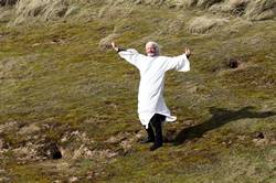 8th March 2009 - St Pirans Play, PerranporthSW 7685 5638 - I make no excuses for going back to Gear Sands near Perranporth for the annual St Pirans play and pilgrimage.The people of Perranzabuloe celebrate St Piran each year on the Sunday closest to St Pirans day. Beneath a concrete cross the play begins. Legend starts in Ireland where the Irish King rules. St Piran visits the villagers. Piran addresses the crowd. The king becomes more worried about the activities of Piran. So he instructs his soldiers to arrest Piran. The soldiers drag Piran onto the cliff top. A millstone is tied around Piran's neck. Piran is thrown off the cliff into the Irish Sea. The distraught villagers protest. Their protests are ignored. Legend has it that Piran floated accross the Irish Sea on the millstone and came ashore on Penhale Sands where he built his Oratory. The Cornish find Piran on the sands. Piran introduces the Cornish to christianity. He heals the sick. Tin is discovered and there are calls for Cornish unity. |