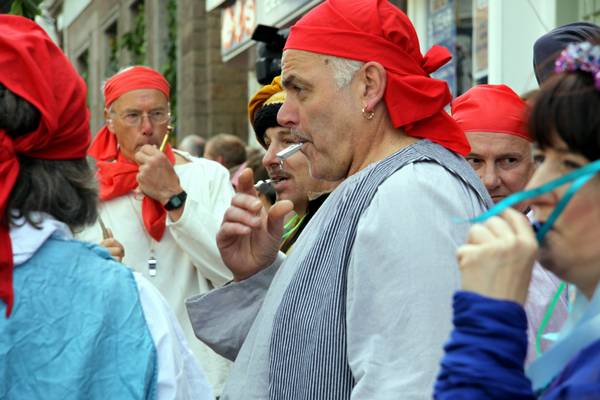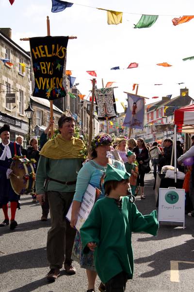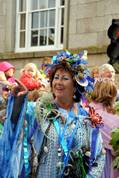 8th May 2009 - Helston Flora Fay - Hal-an-TowThe oldest part of Flora day, the Hal-an-Tow, is completely different to the traditional Furry dances.Revived in 1930 the Hal-an-Tow celebrates the arrival of Spring and the banishing of Winter. This is a noisy event with the sheer number of participants taking part, all blowing whistles, singing or playing musical instruments. Many are dressed in green and carry branches and greenery which are waved whilst they sing. Others dressed in costume represent characters from the songs they sing. The Hal-an-Tow starts at 8.30am by St Johns bridge. The story plays out here and the procession moves onto another six "stations" around the town repeating their message. The official guide says the traditional song is Elizabethan. The Chorus starts "Hal-an-Tow, Jolly rumble O". We rejoin the Hal-an-Tow at the third station which is the junction of Cross Street with Church street. The first verse of the Hal-an-Tow song celebrates people linked with May festivals. including Robin Hood. Local MP Andrew George takes the part of St Michael, who threw a massive stone at the devil who fell beaten into the Loe. The second verse tells of the Spanish Armada. The third verse tells of St George and the Dragon. The official guide says a fourth verse was added by Morton Nance a Grand Bard of Cornwall to include St Michael, Helston and Aunt Mary Moses in the traditional song. The seventh and final station is outside the Guildhall. The Hal-an-Tow players enter from Meneage Street. Whistles still blow. and maidens dance. the final chorus is sung. The Hal-an-Tow players parade down Coinagehall Street. still blowing whistles. playing music and carrying bannewrs proud. some now have to change into morning suits ready for the midday dance. |