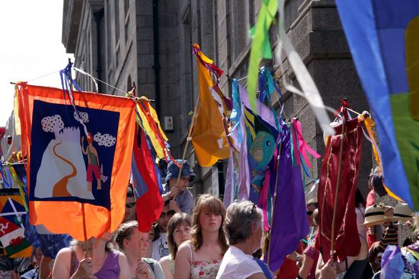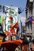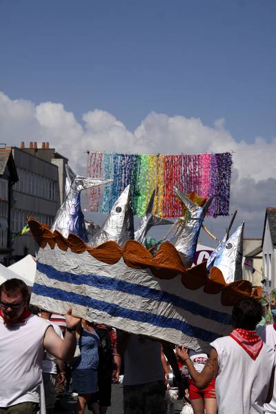 27th June 2009 - Golowan festival - Mazey day - afternoon processionGol-Jowan (Golowan) is the midsummer feast of John.Golowan has evolved over the years into a 10 day festival of community events and music. The festival incorporates Mazey Day with its mardi-gras style of processions. Leading the afternoon procession is the Mousehole Cat, escorted by Mousehole primary school children. There is also a starry gazey pie. Other schools parade with coloured banners and flags. The Golowan band provide some music as the procession makes it way down Market Jew Street. Other large papier mache figures are carried aloft. More characters and banners. Pipes, drums and chinese dancers. |