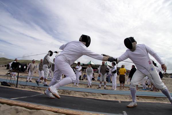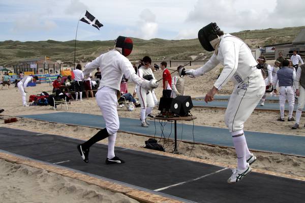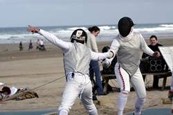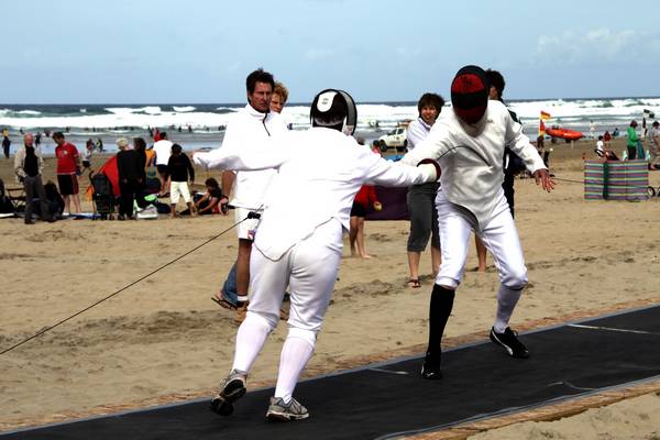 28th August 2009 - Perranporth - Duel on the BeachBank holiday weekend on the beach at Perranporth.I came to photograph Surfboat Rowing heats, only to find the event postponed due to the swell. Even so there was a lot of activity on the beach, surf schools were teaching how to catch the waves. RNLI lifeguards watched the surfers and swimmers, and teams played beach volleyball. In front of the Watering Hole beach cafe I came accross the "Duel on the Beach". This event is hosted by Truro fencing club, who have set up 4 wooden pistes on the beach. 9 teams compete with the foil. Each team has 3 competitors who fence on the wooden pistes. They take it in turns with relays to 36 hits. 9 teams compete with the sabre. and 6 teams compete with the epee. |