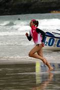 5th September 2009 - European Open Surfboat Championships - Run to the flag.Tolcarne beach, Newquay is the venue for this years championships. For each heat the surfboat starts from the shore and a team of 4 plus the sweep row out over the breaking surf to a mark. Turning at this mark they then row or surf back to shore. One of the crew then has to get out of the surfboat and run to a flag. The first to touch their flag wins the heat.These are images of the runners racing to touch the flag and win the heat. As soon as the surfboat is in shallow water one of the crew jumps out and races up the beach. There are six flags, one for each lane and the runner has to touch their lane flag to finish. Quite often the surfboats do not end up in their correct lane, so boats and runners cross. First to touch the flag wins the heat. You get a different perspective looking down onto the beach from the cliff path. |