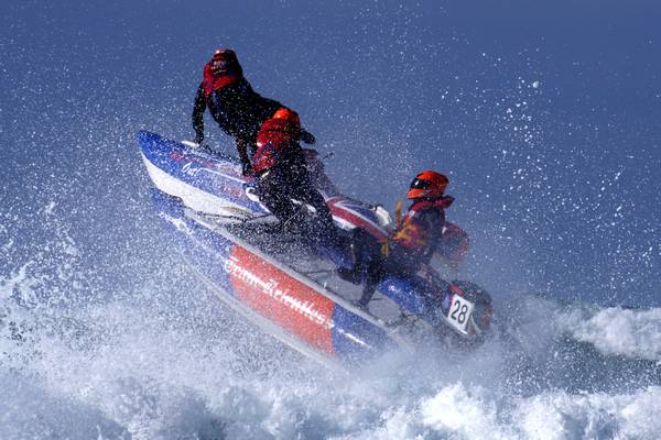 26th September 2009 - Zapcat Racing - Watergate BayHeat 14 - Division Two finals.Watergate bay near Newquay is the venue for Heat 14 of the Zapcat racing season. The racing this Friday and Saturday are the final rounds of the season. 6 teams line up for the division two final. The green flag drops and the Zapcats hit the incoming surf. The waves are close together as the Zapcats leap into the air. The zapcats turn and run close to the shore. At the next bouy a tight left turn, and the teams head back out over the surf. Suddenly one of the Royal Marines teams in "Zapcat 14 - Contact wait out" and "Zapcat 28 - Westgate relentless" get to close and the Marine co-pilot is thrown overboard. One of the other Relentless teams "Team Relentless Zapcat 35 Nine Lives" tries desperately to miss the obstructions ahead of them. having to pass between the two upturned Zapcats. And raise thier hands to acknowledge the red flags stopping the race. After the Zapcat 14 is recovered the remaining teams restart the heat. |