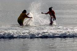 31st January 2010 - Help for Heroes winter dip - East LooeIt was snowing when I left Dobwalls to drive to Looe.Hail still covered the Banjo Pier, there was a cold wind, but the sun was shining. A group of bravehardy people from the Ship Inn gathered on the beach as they have arranged a winter dip to raise money for Help for Heroes. My congratulations to all those involved as I believe they raised over £1200. Suddenly the group ran down the beach. The banner was raised at sea. before long it became too cold for some. I was quite happy to stand on the beach wearing several layers, as groups left the water. Some went back in for a second time. |
