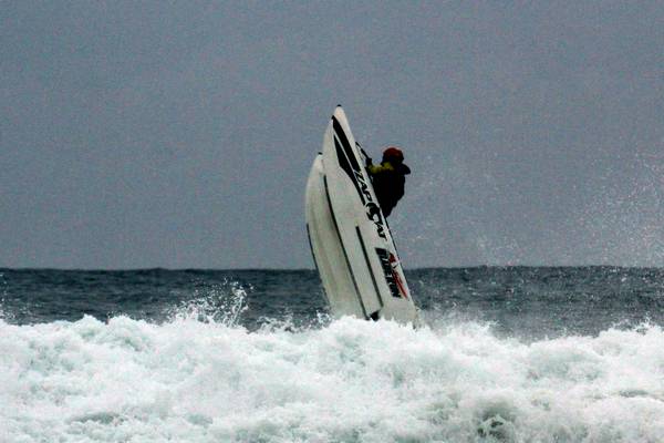 With the surf and off shore wind the Zapcats take to the air. Sometimes the engine stalls.