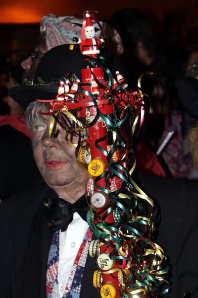Some faces are blacked, but the hats are trimmed with colourful tinsel.