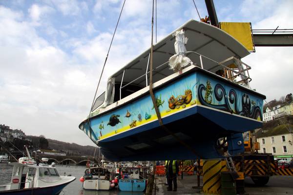 Standing on the West Looe side of the bridge, the red hull of the Boscastle Lass is carefully lowered into the river.
