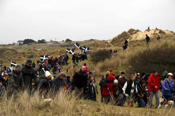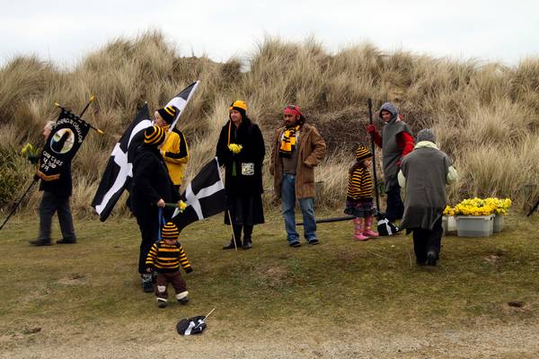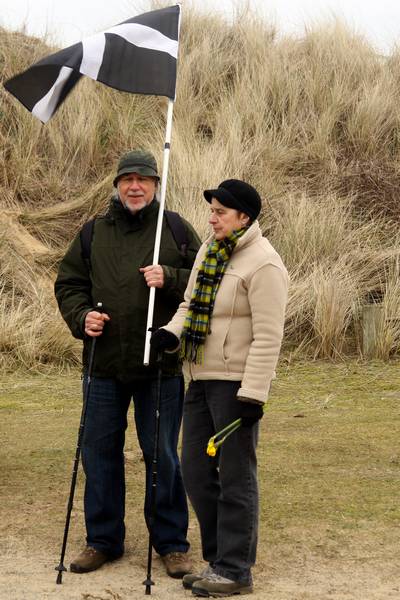 At the end of the pilgrimage, daffodils are left in the three open holes of the cross. Behing the cross Cornish flags are blowing in the wind.