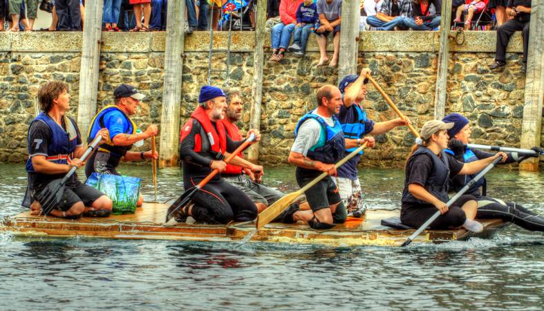 As the adult rafts pass little pier, 5 childrens rafts join the race.
