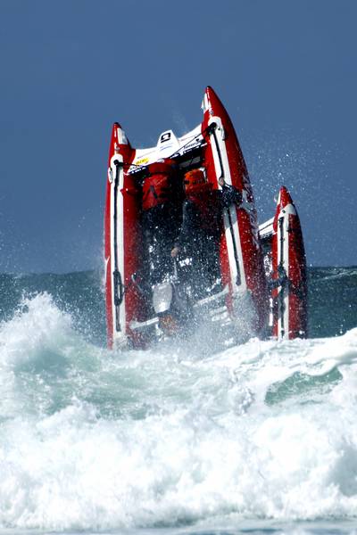 Strong 20 mph on shore winds with 5 to 7 feet waves in tight sets great the intrepid Zapcat teams.