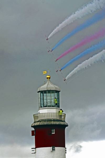 Due to the low cloud level the Red Arrows flew over the Hoe and Smeaton's Tower.