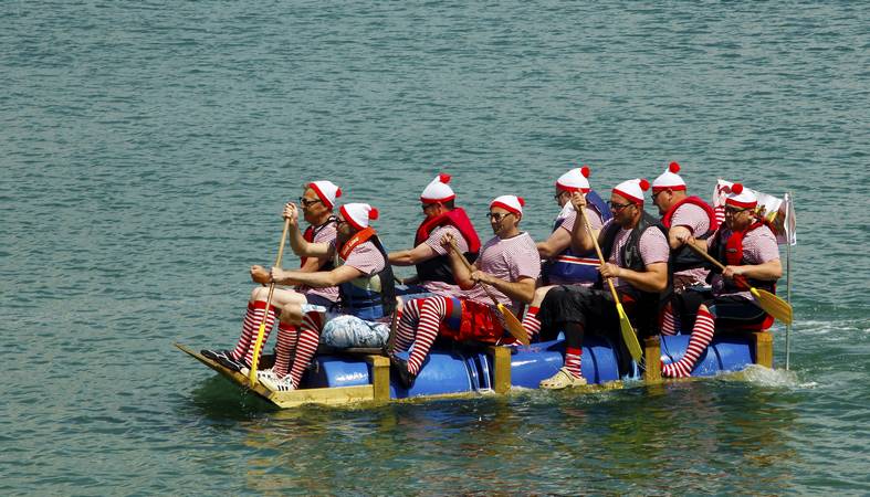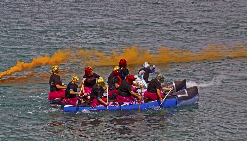 Rafts and their teams of paddlers assemble on East looe Beach, ready for the start at 3pm.
