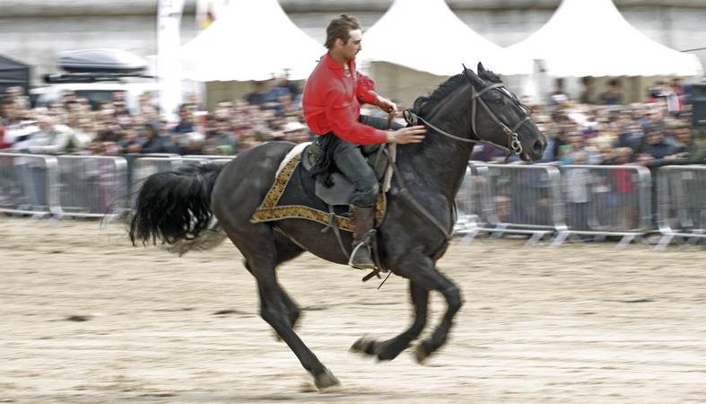 Galloping across the arena each rider displays their gymnastic ability and bravery.