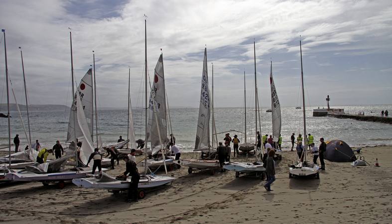 Crews face a strong southerly wind as they sail out to the start line in Looe bay.