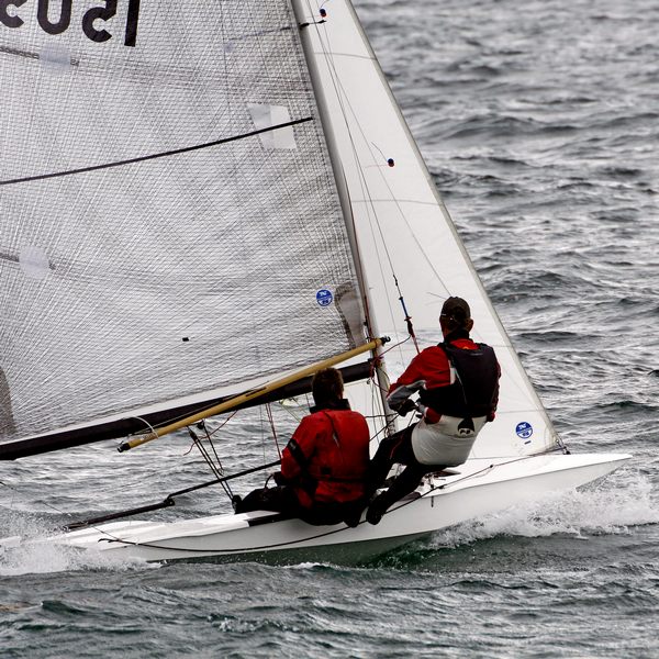 GBR 15083 P&B crewed by Dave Wade and Dan Ellis from Northampton SC, follows GBR 15081 sailed by Niki Birrell and Geoff Edwards representing Parkstone Y.C, out to the start line.