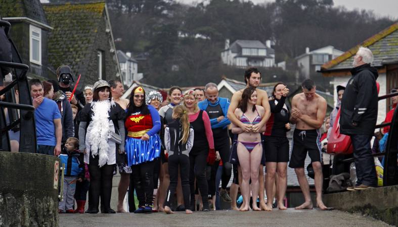 However over 50 intrepid bathers gathered in rain and blustery winds to brave the elements in fancy dress and wetsuits.