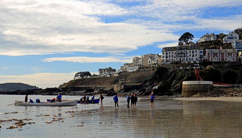 Low tide, calm seas and a warm sunny spring day great the crews as they return to the beach after a training row.
