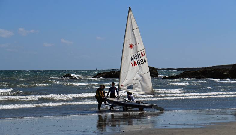Club members in wetsuits help each crew to set off, out into Looe bay.
