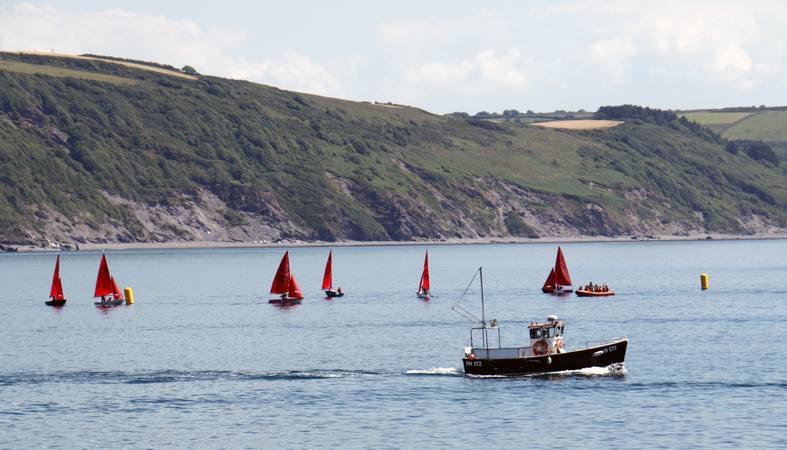 Mirror, Enterprise, Redwing and Laser sailing dinghies leave Looe river and head out into Looe bay for Saturday afternoon racing.