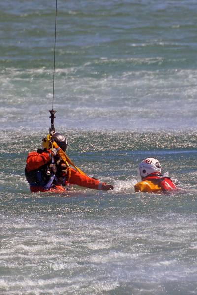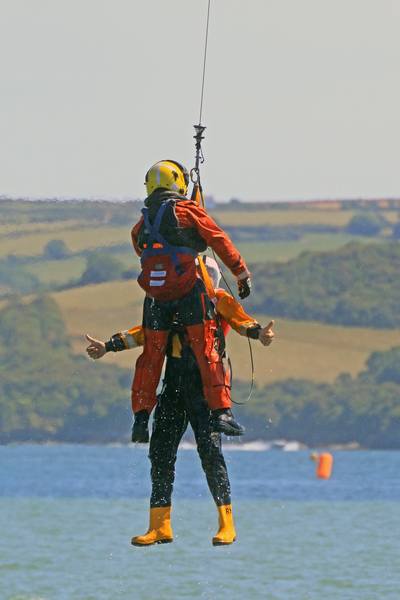 A crewman is transferred to and from Rock RNLI's D class Rusper.