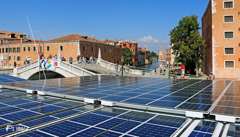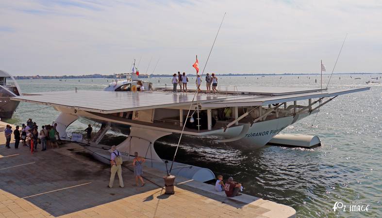 Close to the Rio de l'Arsenal a solar powered vessel is moored alongside the Riva degli Schiavoni quay.