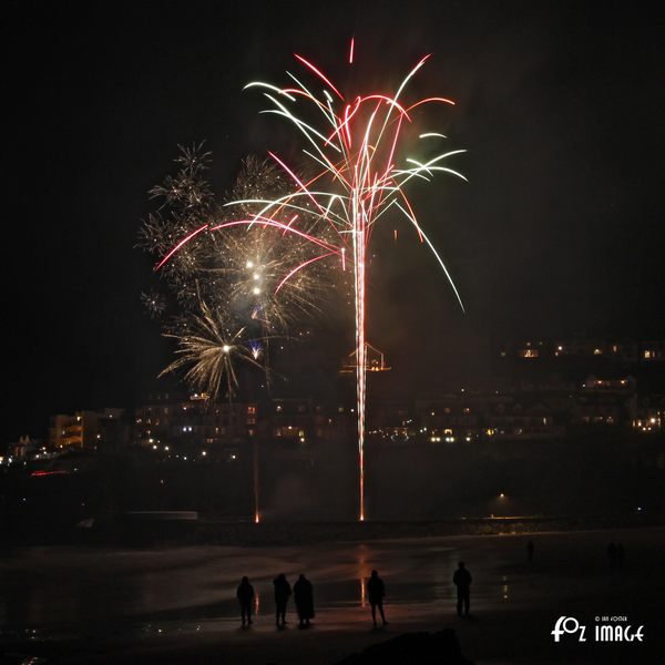Using the length of the banjo Pier, fireworks light up Looe bay.