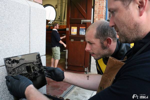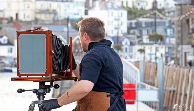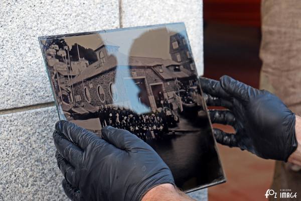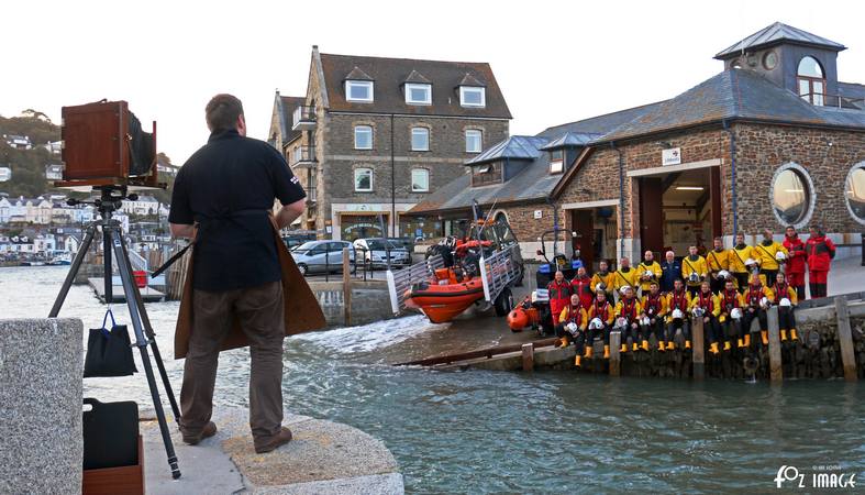 Jack Lowe loads the glass plate into the camera as the crew pose for his photograph.