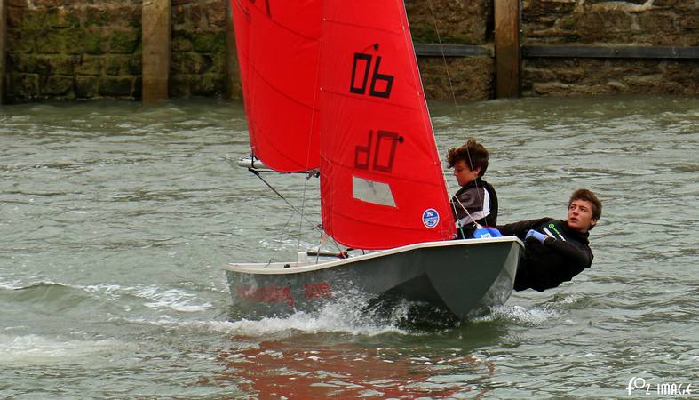 The dinghy sailors face choppy conditions in the river estuary.